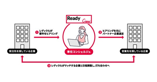 レディクルは、上場企業2,800社の利用実績がある企業と企業をつなぐビジネスマッチングエージェントです。高い傾聴力・提案力を併せ持つコンシェルジュが、システム、プロモーション他、企業のあらゆる発注業務に関わる悩みをヒアリングいたします。伺った内容を元に、レディクル独自のシステムで幅広いネットワークの中から最適な企業をご紹介いたします。受注先のパートナー企業様からのみ費用を頂いており、発注元の企業様からは一切費用を頂いておりません。レディクルご活用事例:https://readycrew.jp/results/