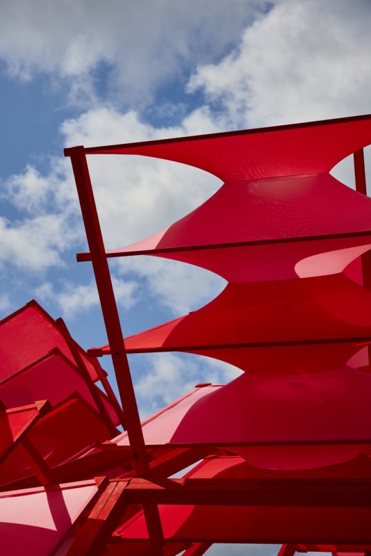 「Circle Dome Squareは、遊び心と少し未来的でもある空間です。着想のもとは、クラシックなスパイラルカメラ。ひとつの被写体にフォーカスするような構造を、私の得意とする素材であるテキスタイルで構築しました。この空間に入れば、外の喧騒から少し離れて、深呼吸をしながら周囲に意識を向けることができる。そんな場所になればと思っています」。