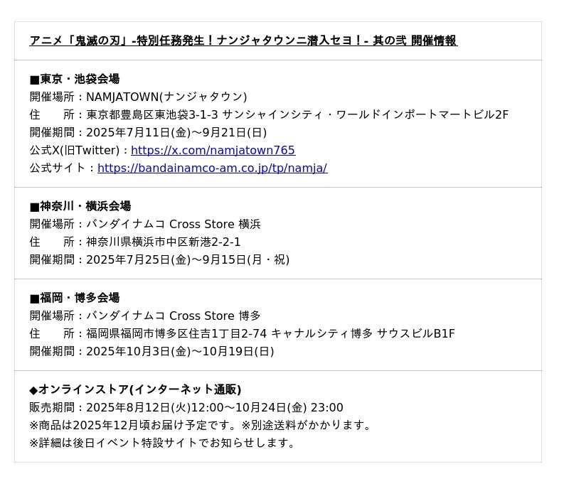7月25日(金)からは「バンダイナムコ Cross Store 横浜」(横浜市)、10月3日(金)からは「バンダイナムコ Cross Store 博多」(福岡市)でもイベントを開催。また、会場で販売するオリジナルグッズはオンラインストアでも展開します。