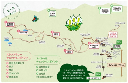 「栂池自然園スタンプラリー」では、自然園内の名所を巡りながら、最奥にある白馬大雪渓を望むビュースポットをめざします。チェックインすると獲得できるデジタルスタンプには、ヤマスタのオリジナルキャラクター「オコジョ君」と「アサギマダラちゃん」が登場。オコジョ君たちと一緒に、高山植物が咲き誇る湿原を巡りましょう。