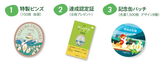 スタンプを集めて条件を達成すると「記念缶バッジ」や「達成認定証」がもらえるほか、抽選で当たる「特製ピンズ」に応募できます。
