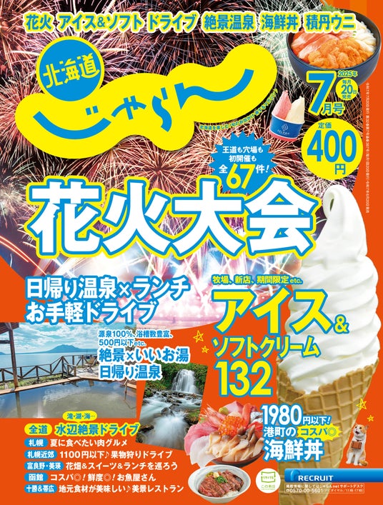 日帰り温泉&ランチお手軽ドライブ、全道花火大会67連発、全道132店!ソフトクリーム&アイス大特集、ALL1,980円以下!港町のコスパ◎豪華海鮮丼、いいお湯×絶景日帰り温泉、滝・湖・海…水辺絶景×地元グルメ×温泉ドライブ…など今月も旬の情報が満載です。ぜひご覧ください。