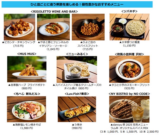 期間中は、クミン、フェンネル、タヒン、山椒、生姜、唐辛子など、様々なスパイスを使用した、各店舗が趣向を凝らした期間限定のオリジナルメニューをご提供します。辛さだけでなく、“食欲をそそる香り” “清涼感” “身体の巡りを整える感覚”といったスパイスの魅力にも注目。暑さで重くなりがちな身体に、爽やかな刺激と心地よい巡りをもたらします。ここでしか出会えない、スパイスの魅力を感じる食の冒険をぜひお楽しみください。
