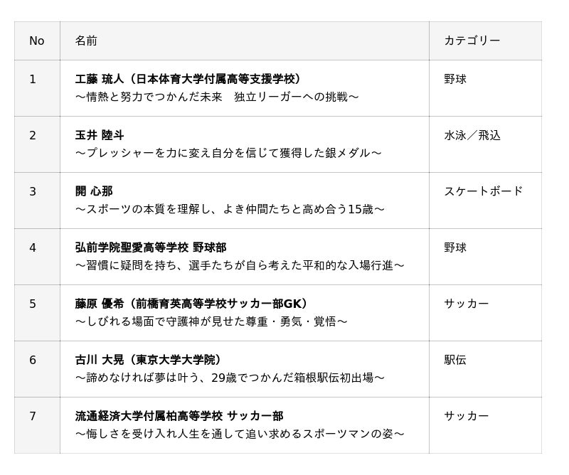 下記、日本スポーツマンシップ大賞2025のノミネート・受賞者一覧(敬称略・50音順)になります。