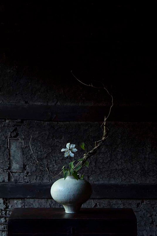 「人間がつくることのできない、神々しい存在」としての花を、不完全な器にそっと添わせ、命の気配を立ち上らせます。