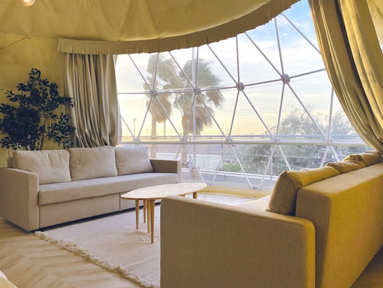 ドーム内には、オットマン付きの大型ラグジュアリーソファ2台、エアコン、冷蔵庫など快適な設備を完備。都心の喧騒を離れ、くつろぎの時間をお過ごしいただけます。