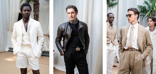 昼間のエレガンスを表現するのはオープンウィーブのスポーツコート、リラックスしたニットウェア、そしてシルクとリネンの贅沢なテクスチャー。タン、アイボリー、ブラウン、ブラックの洗練されたアースカラーのパレットで彩られています。丁寧に考えられた機能的なディテールとモダンなリラックスフィットで控えめなラグジュアリーを体現しています。そして、ハンドメイドのレザーアクセサリー、バッグ、サマーシューズでそれぞれのルックを完成させます。