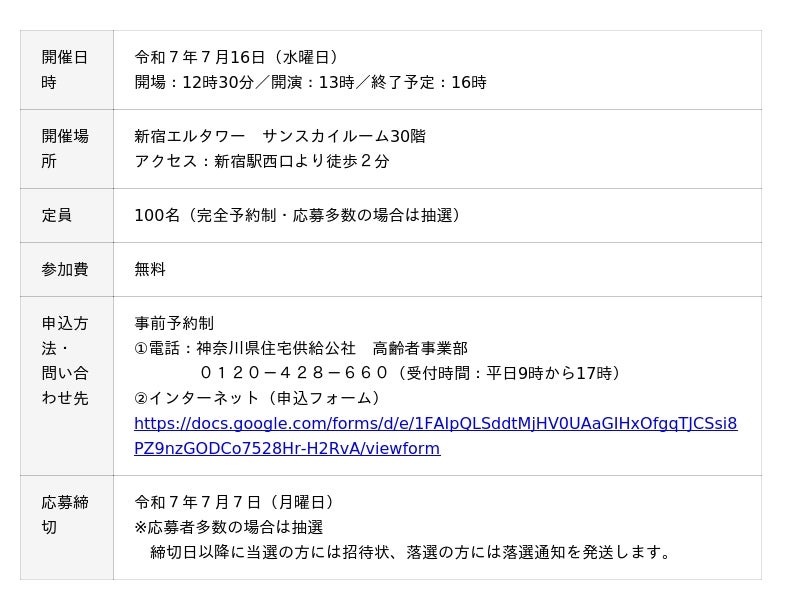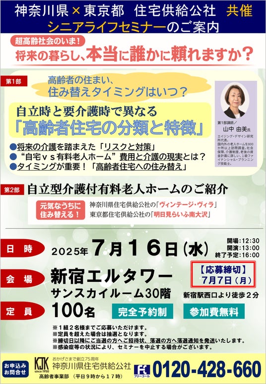 東京都住宅供給公社(東京都渋谷区、理事長:浜佳葉子、以下「JKK東京」)と神奈川県住宅供給公社(神奈川県横浜市、理事長:桐谷次郎)は、「安心して自分らしい暮らしを続けられる住まい」の提供を目指し、令和7年7月16日(水曜日)に、将来に向けて住み替えを検討されている方に向けてシニアライフセミナーを、新宿エルタワーで開催します。