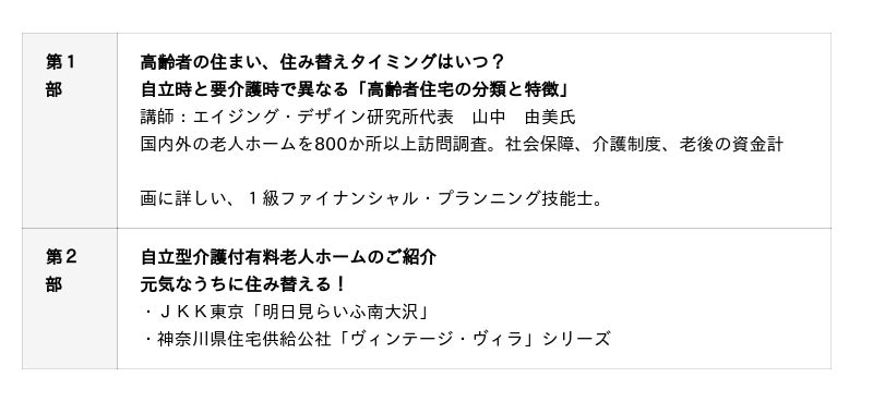 本セミナーの第1部では、講師に山中由美氏を迎え、高齢期の住まいに関する基礎知識や後悔しない選び方をわかりやすく解説します。第2部では、お元気なうちから看取りまで、自分らしく安心・快適な生活を送る選択肢の1つとして東京都と神奈川県両公社の自立型介護付有料老人ホームをご紹介します。