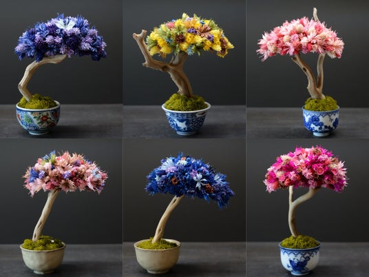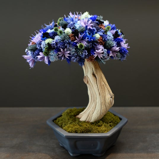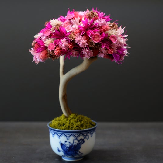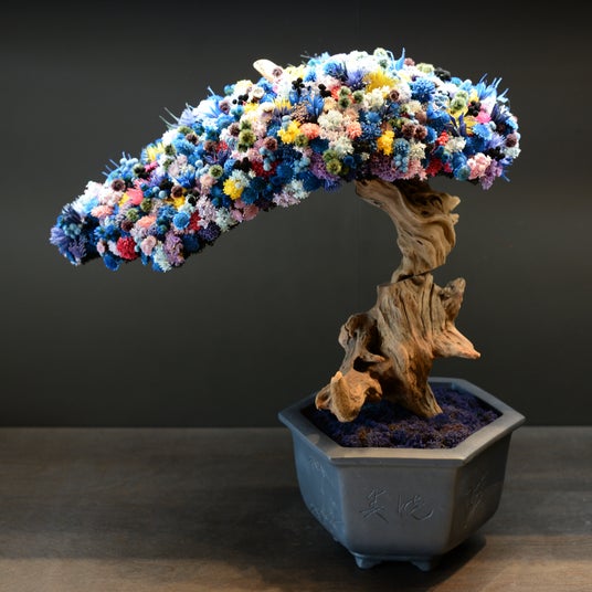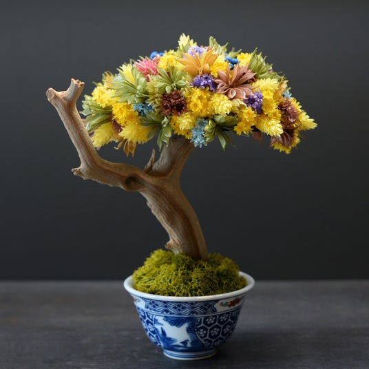 花の部分には発色の良さにこだわった色とりどりのドライフラワーを採用し、環境に配慮した持続可能な取り組みとして、土台となる陶器にリユース素材を選定。幹には陶器と調和する木材を数百種類から厳選し、日比谷花壇が誇る経験豊富なフローリストが長年培ってきた感性と技術を活かし、すべて一点物の手作りアートとして仕上げています。