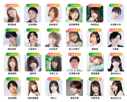 左上から安済知佳、石毛翔弥、和泉風花、石見舞菜香、内田真礼、大渕野々花、岡本信彦、川島零士、木村良平、佐々木琴子、篠原侑、下野紘、直田姫奈、橘杏咲、月音こな、天津飯大郎、富田美憂、長月あおい、波多野翔、前田佳織里、岬なこ、峯田大夢、守屋亨香、結川あさき ほか