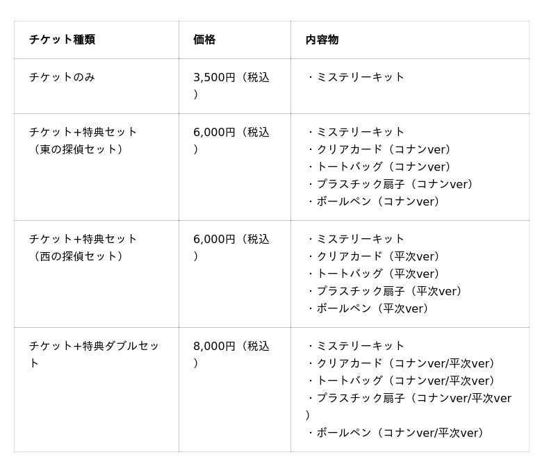 ミステリーキットが入れられるトートバッグや、大阪城を背景に写真が撮れるクリアカードなど、本イベントオリジナルグッズがついてくる特典セットをご用意しました。特典セットは江戸川コナンと工藤新一の「東の探偵セット」と、服部平次の「西の探偵セット」の2種類あり、コナンと平次のイラストとともに、2人をモチーフにしたアイテムが描かれたポップなデザイン。ぜひオリジナルグッズと一緒に大阪城を周遊し、暗号を解き明かしてください。