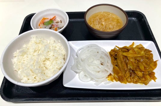 「味処くらや」豚カルビ カレー味定食(1人前)590円白ご飯がすすむ爽やかな辛さが特徴です。