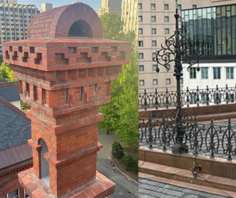 1968(昭和43)年に創建時の姿に復原された換気塔や避雷針