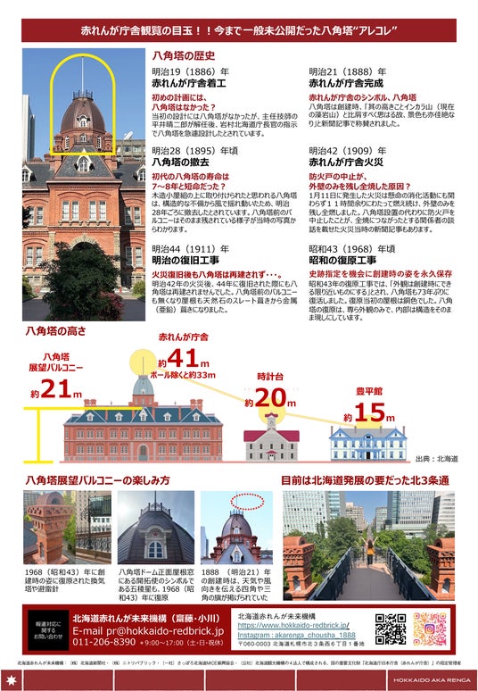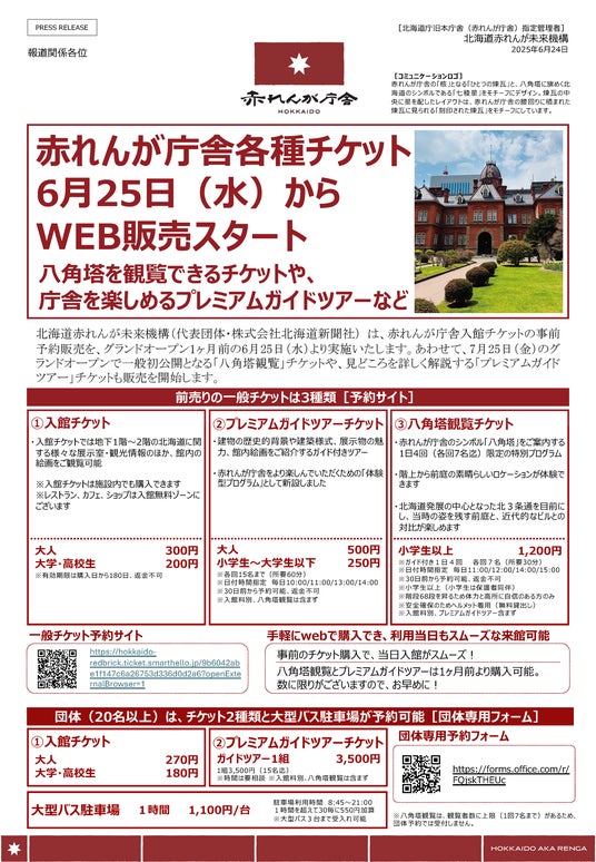 北海道赤れんが未来機構(代表団体・株式会社北海道新聞社) は、赤れんが庁舎入館チケットの事前予約販売を、グランドオープン1ヶ月前の6月25日(水)より実施いたします。あわせて、7月25日(金)のグランドオープンで一般初公開となる「八角塔観覧」チケットや、見どころを詳しく解説する「プレミアムガイドツアー」チケットも販売を開始します。
