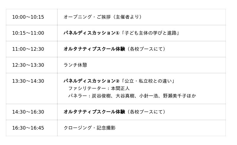 オルタナティブスクールは、子ども一人ひとりの個性と多様性を尊重し、市民によって立ち上げられた「もうひとつの学びの場」です。従来の学校教育の枠にとらわれず、「優秀な子になるのではなく、最高の自分になる」ことを目指します。長期欠席者が50万人を超える現在、公立・私立に続く“第3の選択肢”として注目を集めています。■ 前日開催:「オルタナティブスクール・サミット&フォーラム」(関係者限定)