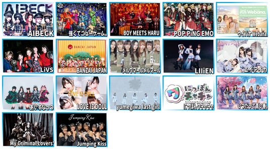 AIBECK/強くてニューゲーム。/BOY MEETS HARU/POP PiNG EMO/ウイバナWebana./LiVS/BANZAI JAPAN/メルクマールメルマール/LlliEN/エイアイカ/あいすなっつ/LOVE IZ DOLL/yumegiwa last girl/にっぽんワチャチャ/いつだって青い春。/My Criminal Lovers'/Jumping Kiss(順不同)