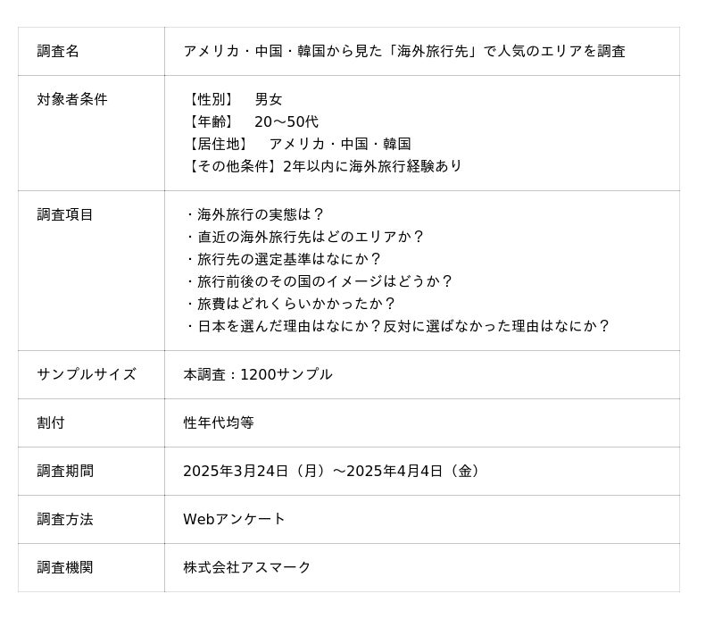 調査項目は、海外旅行の実態、直近の海外旅行先のエリア、旅行先の選定基準、訪日理由などについて聴取しています。