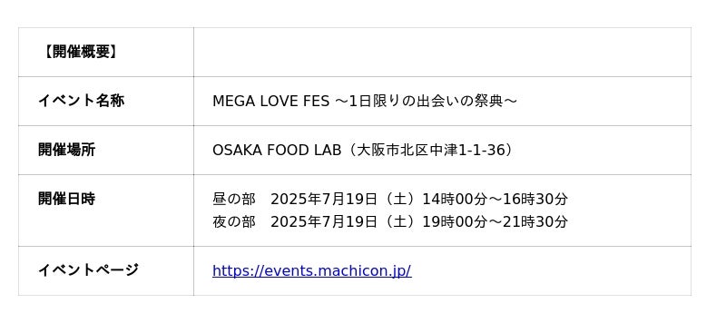 株式会社リンクバル(本社:東京都中央区、代表取締役社長:吉弘和正、証券コード:6046、以下「リンクバル」)が運営するイベントECサイト「machicon JAPAN」は、2025年7月19日に大阪府の「OSAKA FOOD LAB」にて800名規模(昼と夜の各部400名)で開催される恋活イベント【MEGA LOVE FES、以下「本イベント」】のチケット販売を行っております。