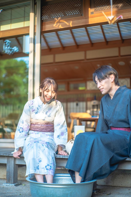 庭園に面する縁側で足水体験。ジメジメとした真夏の宵にぴったりの夕涼みを体験していただけます。