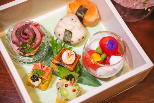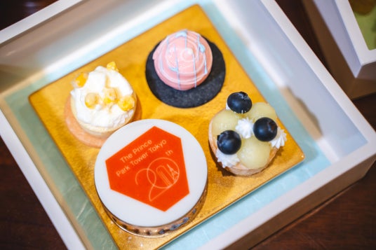 お食事は、涼しげなスイカとモッツァレラチーズのサラダ、厚焼きたまごにトッピングをあしらった3種のピンチョス、おにぎり型のパン2種、ホテル開業20周年を祝うゼリー、夏祭りには欠かせないヨーヨーを象ったムースなど、フォトジェニックなセイボリーとスイーツをご用意いたしました。
