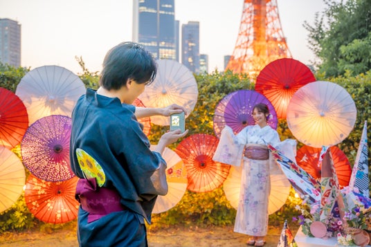 色とりどりの和傘と光が織りなすフォトスポットが登場。お祝いの象徴として古くから日本で親しまれている折り鶴のオブジェは、10周年のお祝いとして設置。東京タワーをバックに夏の想い出を刻んでいただけます。