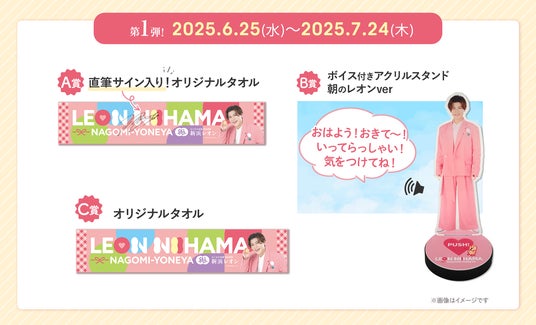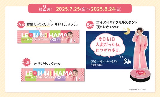 本キャンペーンでは、なごみの米屋直営店で対象商品をご購入のうえ、レシートを撮影・送信いただくと、新浜さんのオリジナルコラボグッズにご応募可能。A賞では新浜さんの直筆サイン入りタオル、B賞ではオリジナルボイスが再生されるアクリルスタンドが当たります。アクリルスタンドは朝ver.・夜ver.の2種類があり、それぞれ第1弾・第2弾で展開されます。