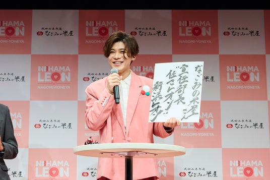 千葉県出身で、今人気急上昇中の歌手・新浜レオンさんが、ブランドの宣伝部長に就任。会場では小学校の遠足で必ず選ぶほど、小さいころからなごみの米屋の商品と共に育ったと思い出を語りました。また就任に際し新浜さんが「宣伝部長”任さレオン”」と“レオン語”で宣伝部長就任に対する意気込みを書き初めし、会場全体を盛り上げました。「千葉の魅力をなごみの米屋さんと共に一緒に世界に伝えていきたい」と語る姿には、地元愛と普段から購入されているブランドへの情熱がにじみ出ており、ファンや関係者の期待感も一層高まる場面となりました。