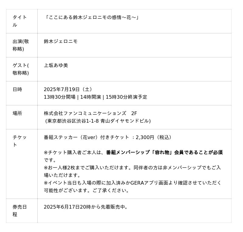 プロシューマー支援事業を展開する株式会社ファンコミュニケーションズ(本社:東京都渋谷区、代表取締役社長:二宮幸司 東京証券取引所プライム市場:2461)が運営する、国内最大級のお笑いラジオアプリ「GERA(ゲラ)は、鈴木ジェロニモがパーソナリティを務める現在配信中の「鈴木ジェロニモの感情」の番組イベントを7月19日(土)に開催いたします。