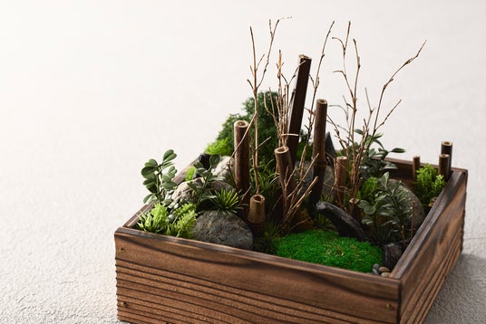 箱庭「箱庭日和」紀州景石や黒竹・穂先の入った焼杉板の箱に、プリザード加工を施したコケやフェイクグリーンの緑をふんだんに盛り付け、ほのぼのとした和やかな自然の風景を表現いたしました。