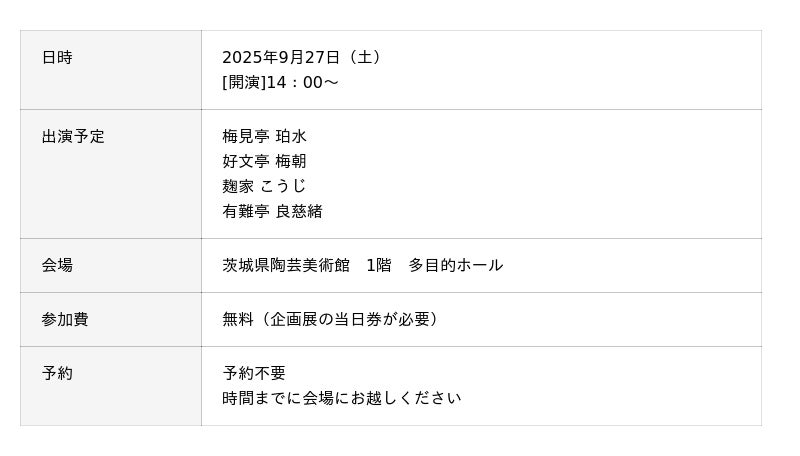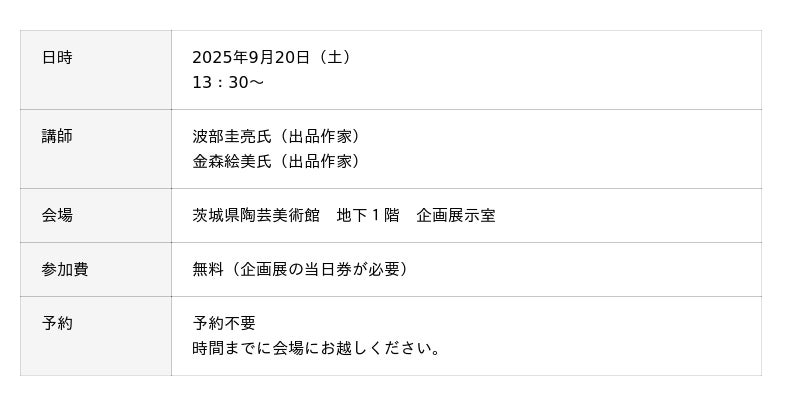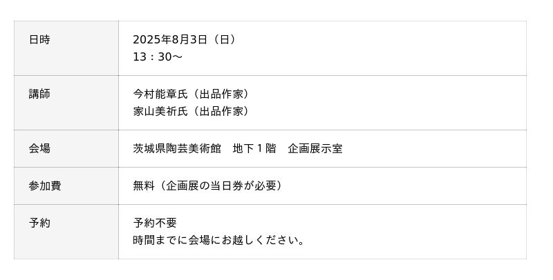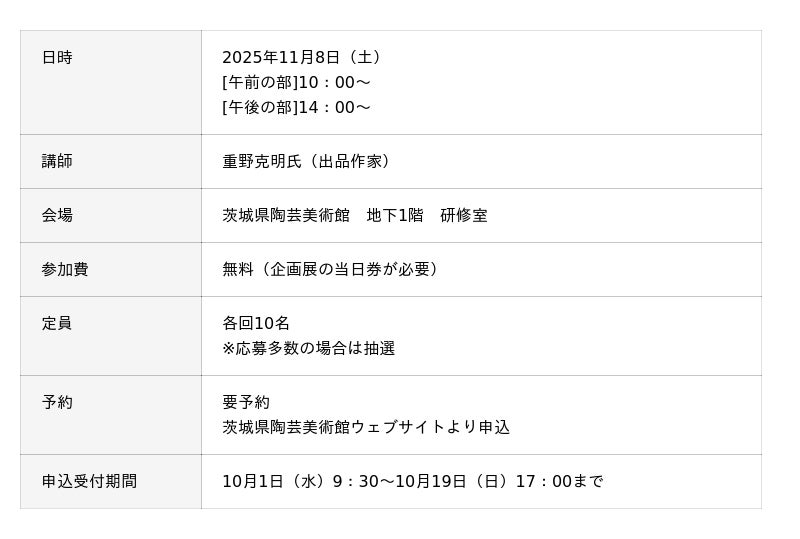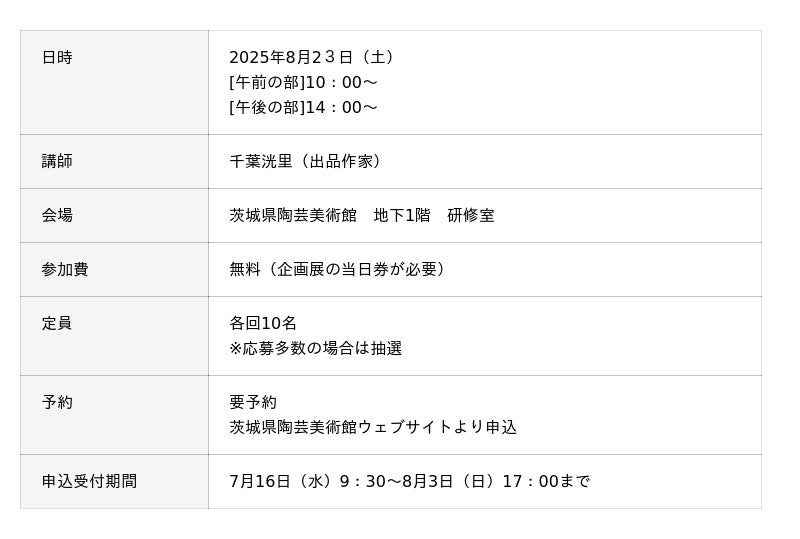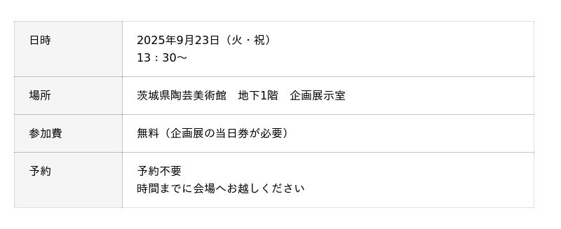 イベントの詳細や申し込みについては、茨城県陶芸美術館ウェブサイトをご確認ください。