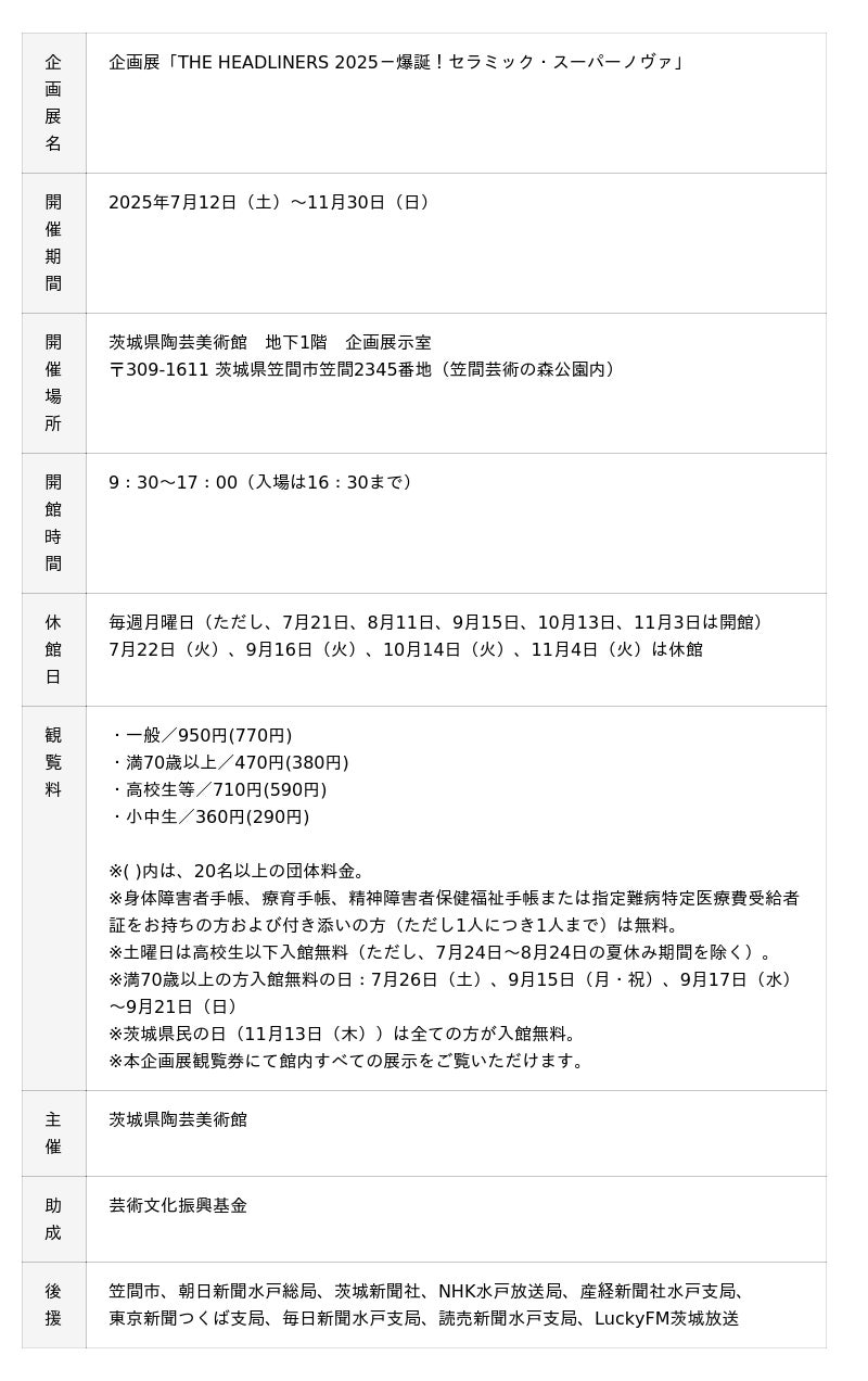 茨城県陶芸美術館(茨城県笠間市笠間2345(笠間芸術の森公園内) 館長:金子賢治)は、企画展「THE HEADLINERS 2025-爆誕!セラミック・スーパーノヴァ」を2025年7月12日(土)より開催します。