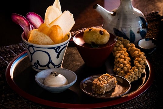 国の重要無形民俗文化財に指定されている種子取祭にゆかりある食材を使用した朝食を提供します。種子取祭に欠かせない食材の粟を混ぜ込んだご飯をはじめ、ニンニクとタコを合わせた「ピンタク」など伝統食を取り入れています。食事の始めには、神事の際にお供えするお神酒「ミシャク」をアレンジした甘酒を提供します。縁起が良いとされるメニューが並ぶ、活力が湧く朝食です。