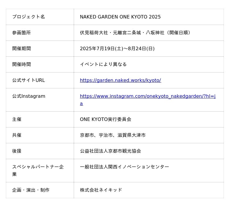 株式会社ネイキッド(英語表記:NAKED, INC. 所在地:東京都渋谷区 代表:村松亮太郎)は、京都市、宇治市、滋賀県大津市とともに共創するアートプロジェクト『NAKED GARDEN ONE KYOTO 2025』夏のガーデンを2025年7月19日(土)から8月24日(日)まで実施いたします。