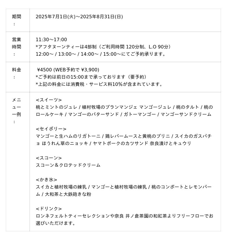 夏の果実、桃とマンゴーを主役にしたアフタヌーンティー。桃のロールケーキ、黄桃と2種の桃コンポートを使ったタルト、ヨーグルトのムースと重ねたガトー・マンゴーなど、香りも食感も多彩に楽しめるスイーツが勢ぞろい。冷製リガトーニやスイカのガスパチョ、奈良漬けとキュウリのカツサンドといったセイボリーも夏らしく軽やかに。見た目も味も涼やかに、午後のティータイムを彩ります。【トロピカルアフタヌーンティー 開催概要】