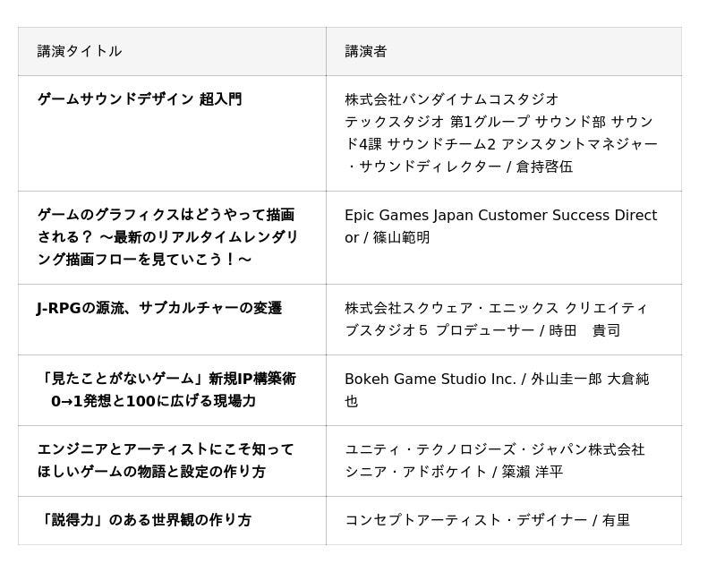 『FINAL FANTASY IV』、『LIVE A LIVE』に携わった株式会社スクウェア・エニックス 時田 貴司氏による講演「J-RPGの源流、サブカルチャーの変遷」や、『ワンダと巨像』に携わったユニティ・テクノロジーズ・ジャパン株式会社 𥱋瀬 洋平氏による講演「エンジニアとアーティストにこそ知ってほしいゲームの物語と設定の作り方」をはじめ、シナリオからグラフィックまで多彩なジャンルの講演ラインナップとなりました。