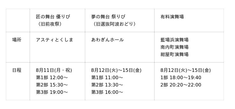【日程】8月11日(月・祝)~15日(金) 【会場】匠の舞台 優りび(アスティとくしま)/夢の舞台 祭りび(あわぎんホール)/有料演舞場 (藍場浜・南内町・紺屋町)