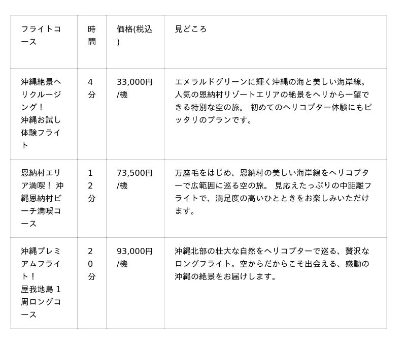 沖縄本島および周辺離島を含む複数の離発着拠点を活用し、渋滞や交通制約の影響を受けない移動手段として、ヘリコプター移動の販売を進める予定です。
