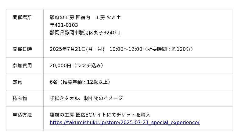 9:55 駿府の工房 匠宿内 工房 火と土にて体験受付