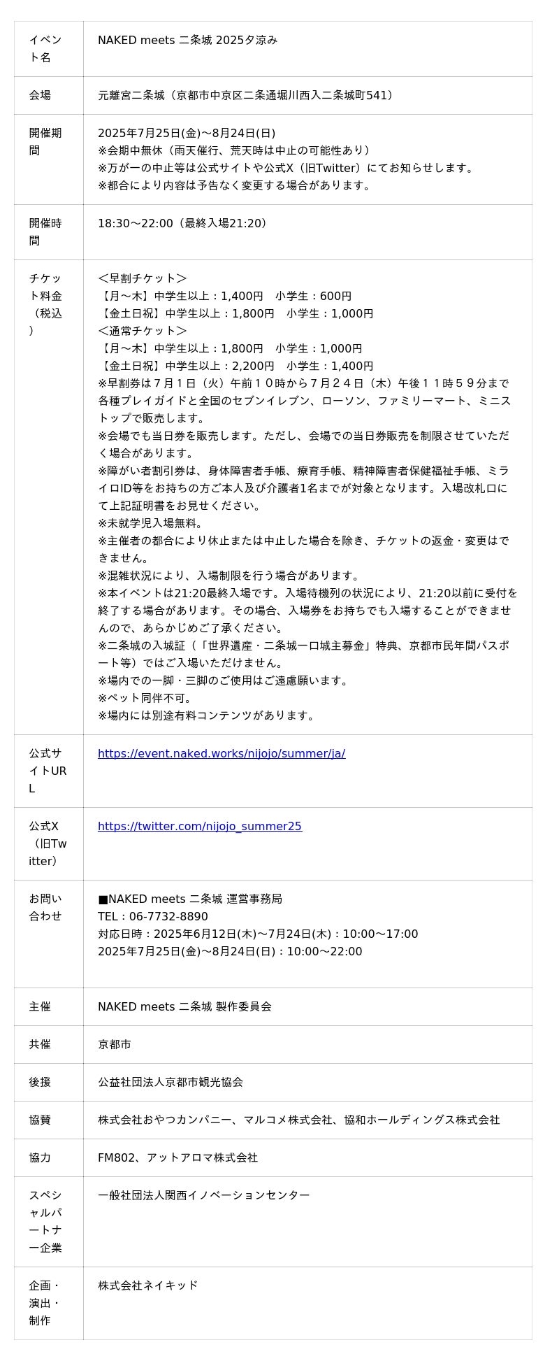 『NAKED meets 二条城 2025 夕涼み』開催概要