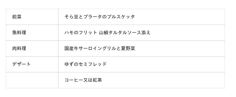 その他、前菜には夏の食材とイタリア原産のチーズ「ブラータ」を使い、夏のみずみずしい緑を表現したイタリア風ガーリックトースト「そら豆とブラータのブルスケッタ」、肉料理には国産牛サーロインステーキを赤ワインですっきりと仕上げたソースに夏野菜を添えてお召し上がりいただきます。
