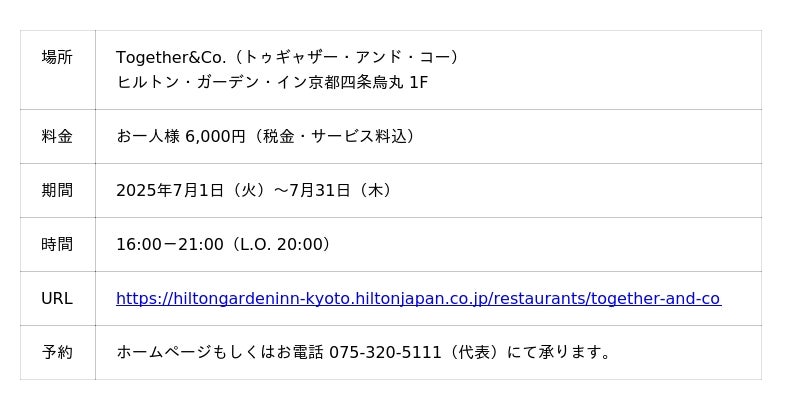 ヒルトン・ガーデン・イン京都四条烏丸(京都市下京区 総支配人 伊藤彰得)は、7月1日よりはじまる京都の祇園祭にあわせ、「祇園祭特別ディナーコース」を7月1日(火)よりホテル内のレストラン「Together&Co.」(トゥギャザー・アンド・コー)で提供いたします。
