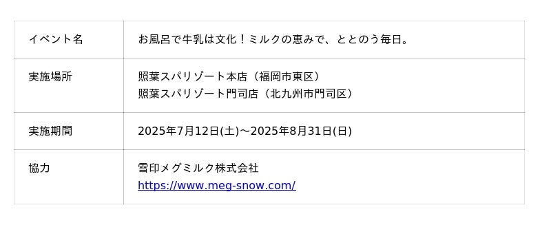「照葉スパリゾート」などの温浴複合施設を運営する株式会社ナカシロは、2025年7月12日(土)から8月31日(日)までの期間、「照葉スパリゾート本店」(福岡市)および「照葉スパリゾート門司店」(北九州市)にて、2025年5月に創業100周年を迎えた雪印メグミルク株式会社とのコラボレーション企画「お風呂で牛乳は文化!ミルクの恵みで、ととのう毎日。」を開催いたします。本イベントは、日本の食卓から牛乳が消える危機に直面する酪農家への支援と、お風呂上がりの牛乳という日本の大切な文化を次世代に繋ぐための、照葉スパリゾートからのメッセージです。