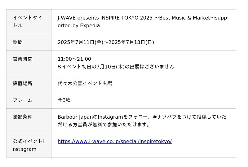 ラジオ局J-WAVE(81.3FM)が主催する「INSPIRE TOKYO 2025」は、「TOKYO POP CULTURE TO THE WORLD」をテーマに、東京・渋谷を舞台にした、音楽ライブと多様なマーケットを展開するイベントです。バブアーは7月11日(金)~7月13日(日)の3日間、代々木公園イベント広場のマーケットエリアに出展。ここでしか撮れないフレームで、素敵な思い出を残してみてください。撮影した画像はその場でデータでもお渡しいたします。