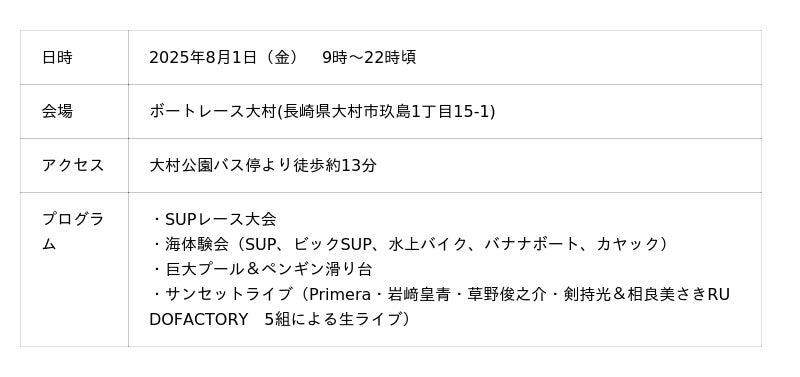 長崎の里海「大村湾」を身近に感じ海の魅力を知ることで、大村湾をもっと好きになってもらうことを目的として、海の夏祭り「大村湾フェスタ」を開催いたします。実際にボートレースが行われている競走水面を解放し、SUPレース大会を開催!チームで競いながら、大村湾の特徴である「穏やかな波」を体感します。さらにビックSUPやバナナボート、水上バイクなどのマリンアクティビティ体験も!普段はなかなかできない体験を通して、大村湾に親しみます。1日を通して大村湾を楽しみつくすイベントです。また来場者特典として、先着700名の方にオリジナル「防災ボトル」をプレゼント!もしもの災害や海での事故にそなえておく防災グッズとして活用いただけます。