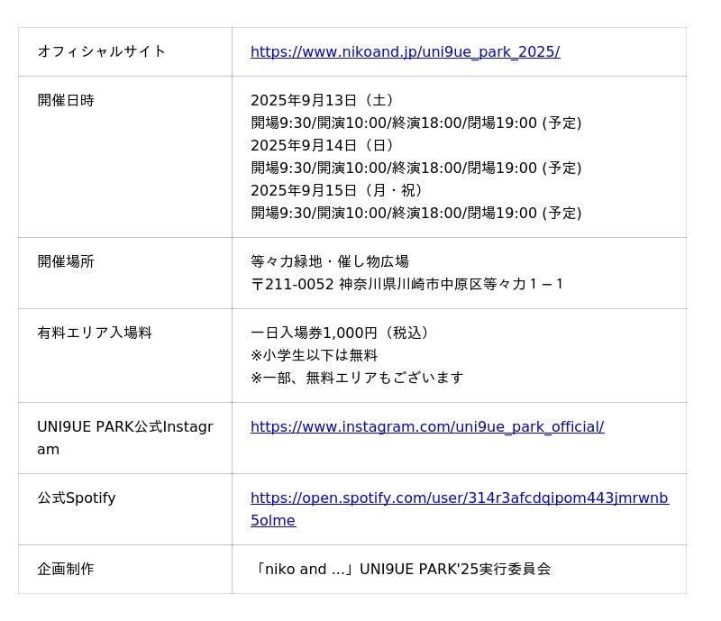 株式会社アダストリア(本部:東京都渋谷区渋谷2-21-1、代表取締役社長:木村 治)が展開するスタイルエディトリアルブランド「niko and ...(ニコアンド)」は、ブランドが掲げる“uni9ue senses(ユニークセンス)”(衣・食・住・遊・知・健・旅・音・LOCAL)を通して、これまで体験したことのない驚きや発見に出会える都市型カルチャーイベント「niko and ... UNI9UE PARK MARCHE’25(ニコアンド ユニークパークマルシェ’25)」を2025年9月13日(土)・9月14日(日)・9月15日(月・祝)の3日間、神奈川県川崎市の等々力緑地の催し物広場にて開催いたします。