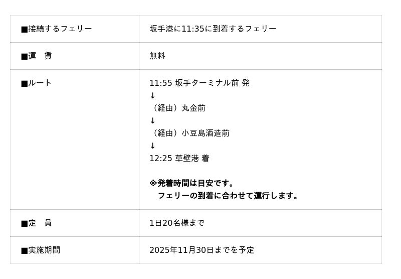 ジャンボフェリー株式会社(本社:神戸市中央区、代表取締役社長:山神 正義)は、2025年7月1日から、小豆島において、「坂手港ターミナル前」から「草壁港」までの無料連絡バスの運行を社会実験として開始いたしました。