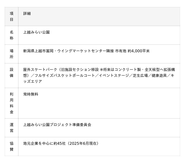 計画中の公園にはスケートボードやバスケットボール、芝生広場、ダンスステージなどを無料で楽しめる複合施設を備え、2025年7月の開園を目指しています。現在は市民有志を中心に CAMPFIRE でクラウドファンディング(目標600万円、7月31日まで)を実施中。地元企業を中心に約45社の協賛と上越市の後援を受け、地域一体となった新しい文化・交流拠点づくりに挑んでいます!