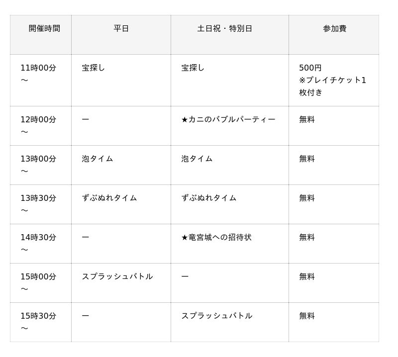 週末だけの特別イベントや開催日限定のイベントから毎日開催の「水」を使用したずぶぬれタイムなど、いつでも楽しいイベントが盛りだくさんです。