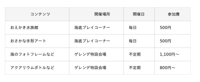 ※「海のフォトフレーム」「アクアリウムボトル」は不定期開催となります。
